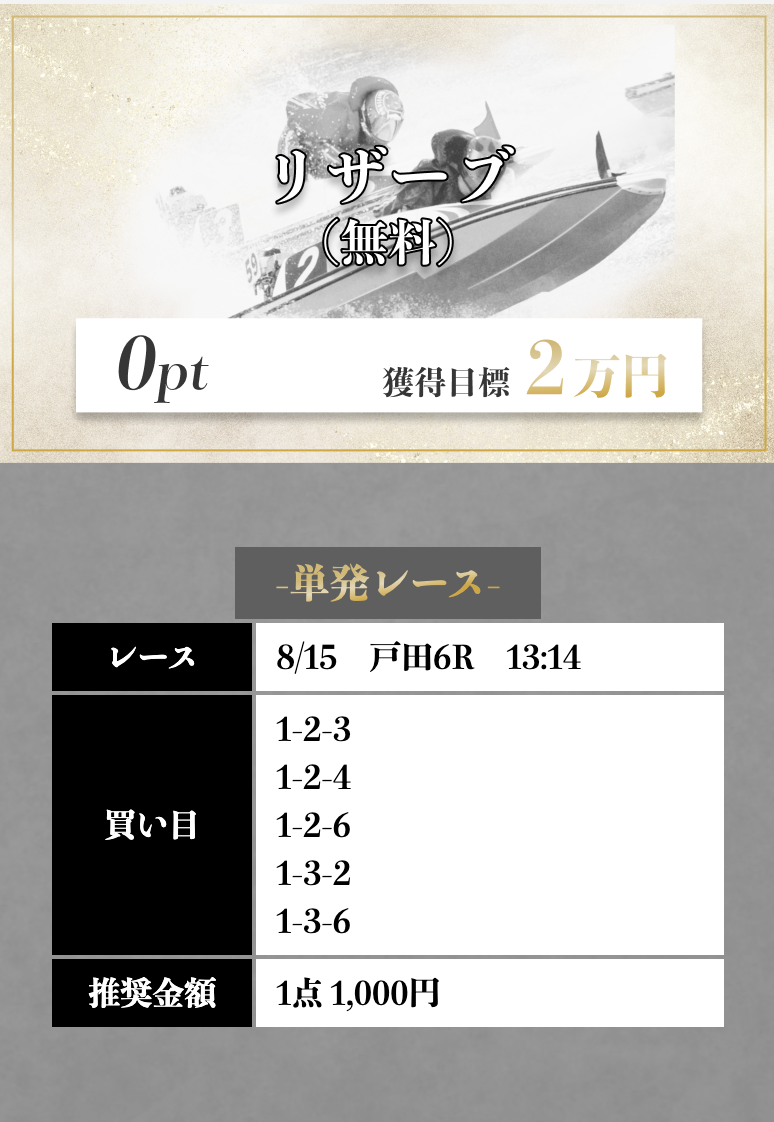 1-3-6 | ○25,9倍 | 0pt | ¥5,000 | ¥25,900 | +20,900円 | |