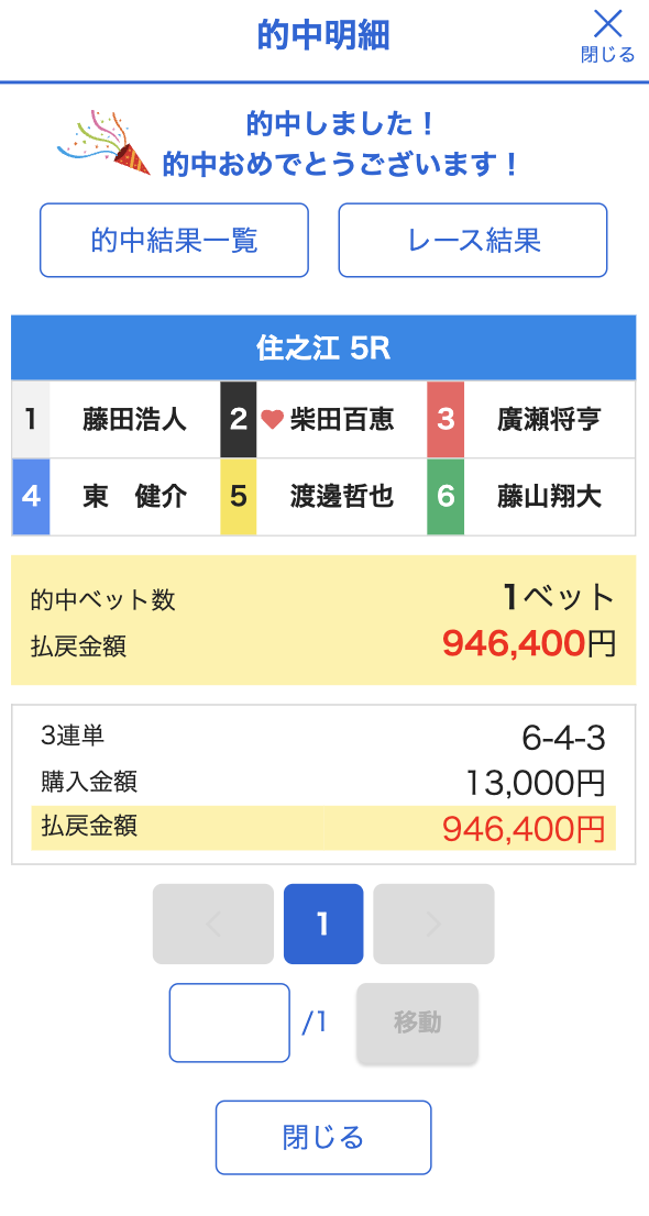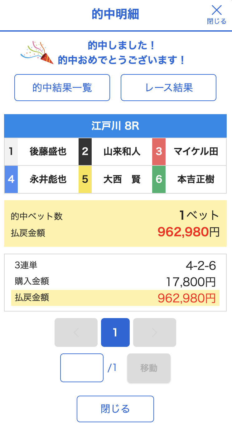 4-1-6 | ○21,4倍 | 0pt | ¥5,000 | ¥21,400 | +16,400円 | |