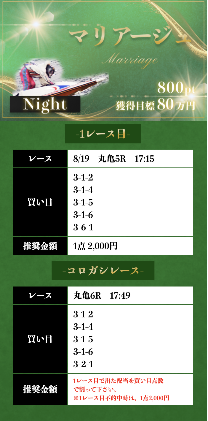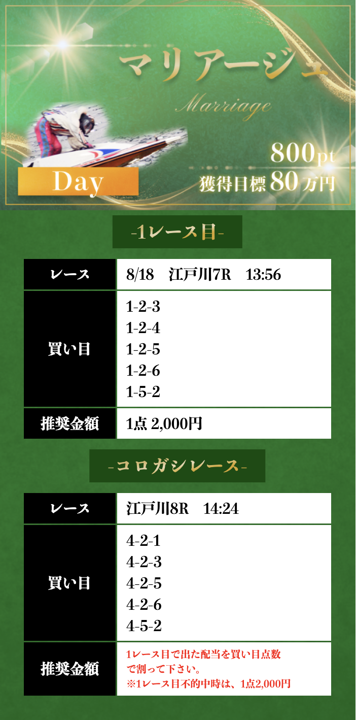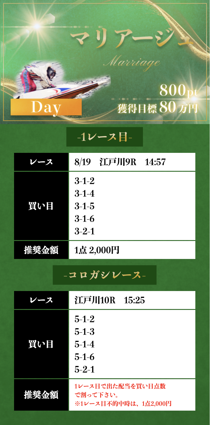 | 8/19 | マリアージュ デイ | 800ポイント | ¥20,000 | 失敗 | ¥0 | ¥754,460 |