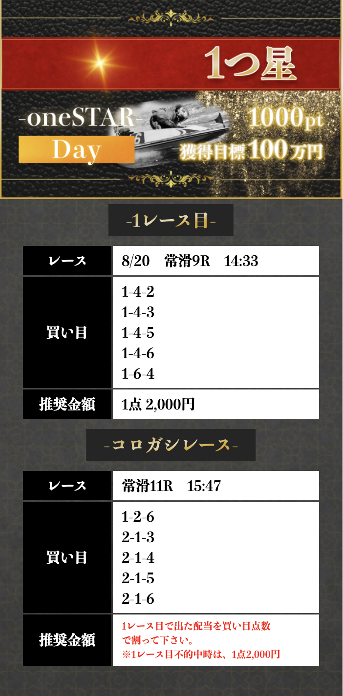 | 8/20 | 1つ星 デイ | 1000ポイント | ¥10,000 | コロガシ成功 | ¥1,252,160 | ¥2,226,900 |