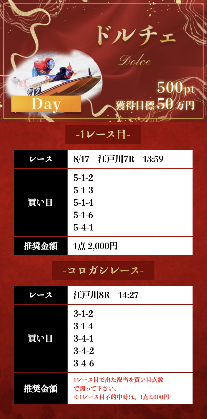 | 8/17 | ドルチェ デイ | 500ポイント | ¥20,000 | 失敗 | ¥0 | ¥325,910 |